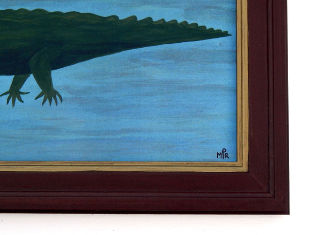 A striking fine art print of a naïve folk art painting by British artist Matt Rix, portraying a dramatic river scene rich in atmosphere and narrative. In the foreground, a large deep-green alligator glides through murky water, its beady eye hinting more at playfulness than menace. Jagged teeth and broad, expressive feet give the creature character and presence. Beyond it, a red and cream paddle steamer travels the river, black funnels releasing pale steam into a soft grey sky, evoking the restless spirit of the Mississippi. The scene blends whimsy and history with moody skies and southern heat.
