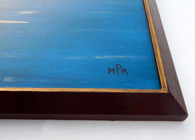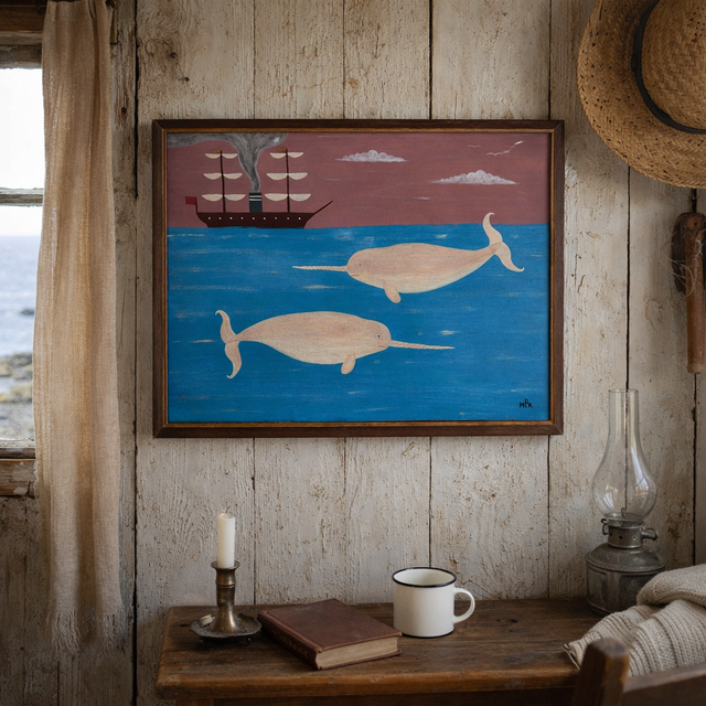 A charming folk art painting on board by British artist Matt Rix, this whimsical nautical scene is filled with warmth, colour, and character. Two creamy-white narwhals, their distinctive spiral horns carefully detailed, glide through a blue ocean flecked with white foam. Above them, an early steamship with sails crosses the horizon, releasing soft grey smoke from its tall funnel. A red flag flies at the stern, while small yellow pennants flutter from the mast tips, adding lively accents. The sky is washed in dusky pink tones, with two grey clouds and three stylised gulls in gentle flight. Measuring 54 cm x 42 cm, the painting is presented in a hand-painted wooden frame finished in brown with a gilt inner edge. The reverse is lined with a collage of antique papers, enhancing its crafted, tactile appeal. Beautifully presented and ready to hang, this work captures Rix’s distinctive folk art style and affection for maritime subjects.
