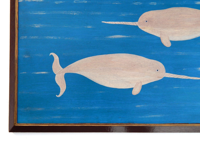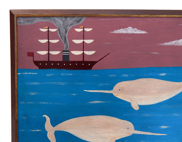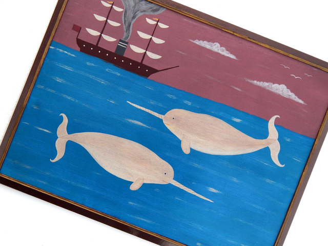 Naive Nautical Folk Art Painting With Narwhals And Steamship By Matt Rix